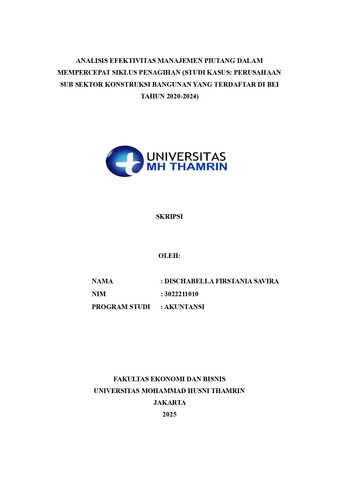 Dischabella Firstania, Savira (2025) ANALISIS EFEKTIVITAS MANAJEMEN PIUTANG DALAM MEMPERCEPAT SIKLUS PENAGIHAN (STUDI KASUS: PERUSAHAAN SUB SEKTOR KONSTRUKSI BANGUNAN YANG TERDAFTAR DI BEI TAHUN 2020-2024). Other thesis, Universitas Mohammad Husni Thamrin.
