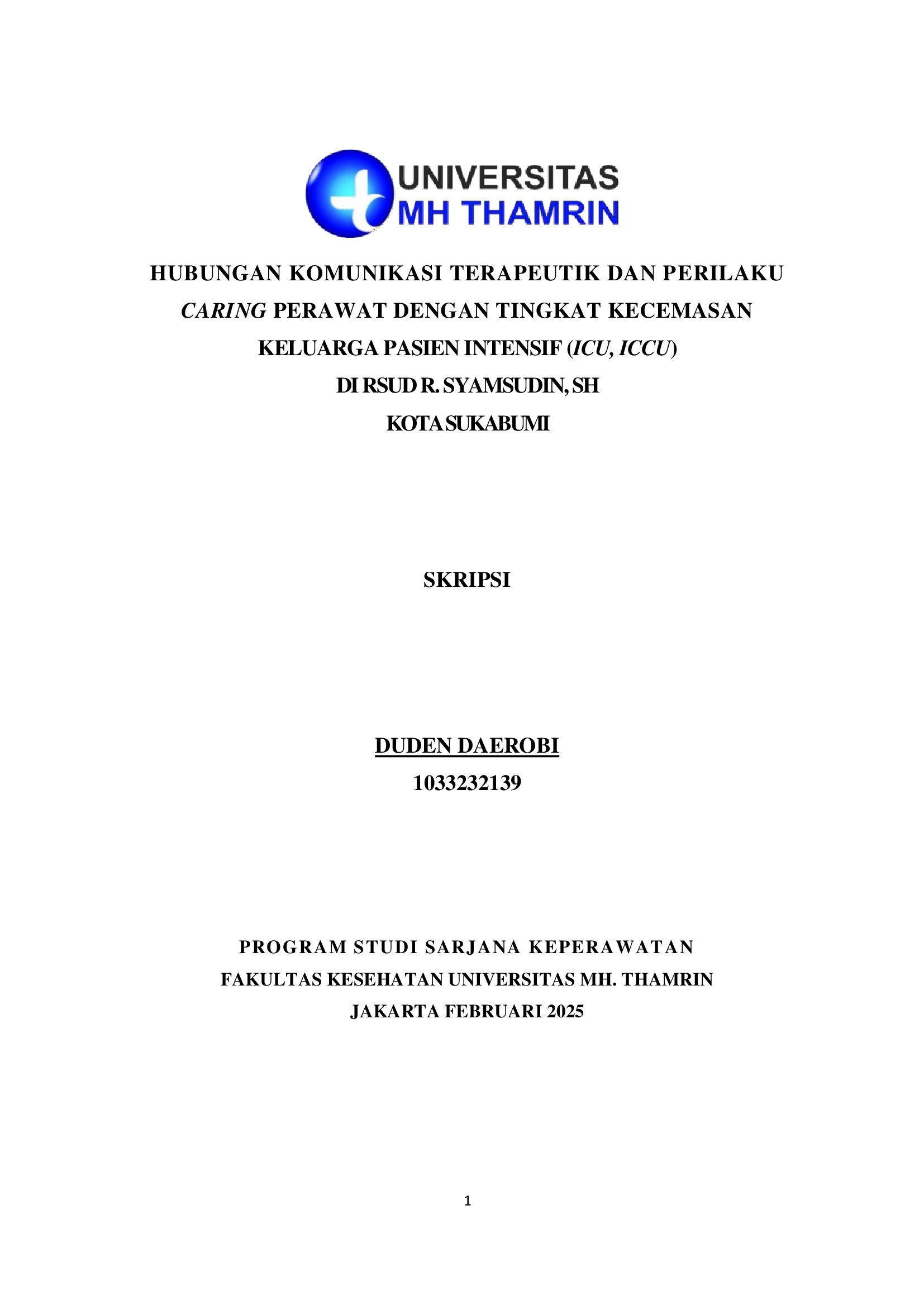 Duden, Daerobi (2025) HUBUNGAN KOMUNIKASI TERAPEUTIK DAN PRILAKU CARING PERAWAT DENGAN TINGKAT KECEMASAN KELUARGA PASIEN INTENSIF (ICU, ICCU) DI RSUD R. SYAMSUDIN, SH KOTA SUKABUMI. Other thesis, Universitas Mohammad Husni Thamrin.