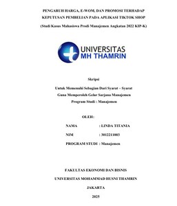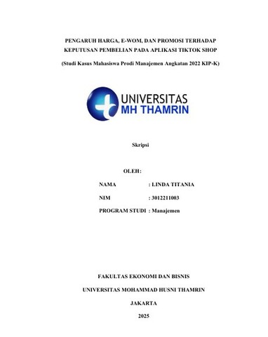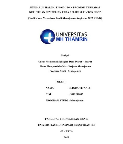 Linda, Titania (2025) PENGARUH HARGA, E-WOM, DAN PROMOSI TERHADAP KEPUTUSAN PEMBELIAN PADA APLIKASI TIKTOK SHOP (Studi Kasus Mahasiswa Prodi Manajemen Angkatan 2022 KIP-K). Other thesis, Universitas Mohammad Husni Thamrin.