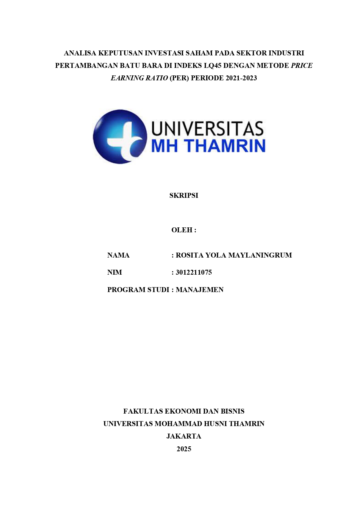 Rosita, Yola Maylaningrum (2025) Analisis Keputusan Investasi Saham pada Sektor Industri Pertambangan Batu Bara di Indeks LQ45 dengan Metode Price Earning Ratio (PER) Periode 2021-2023. Other thesis, Universitas Mohammad Husni Thamrin.