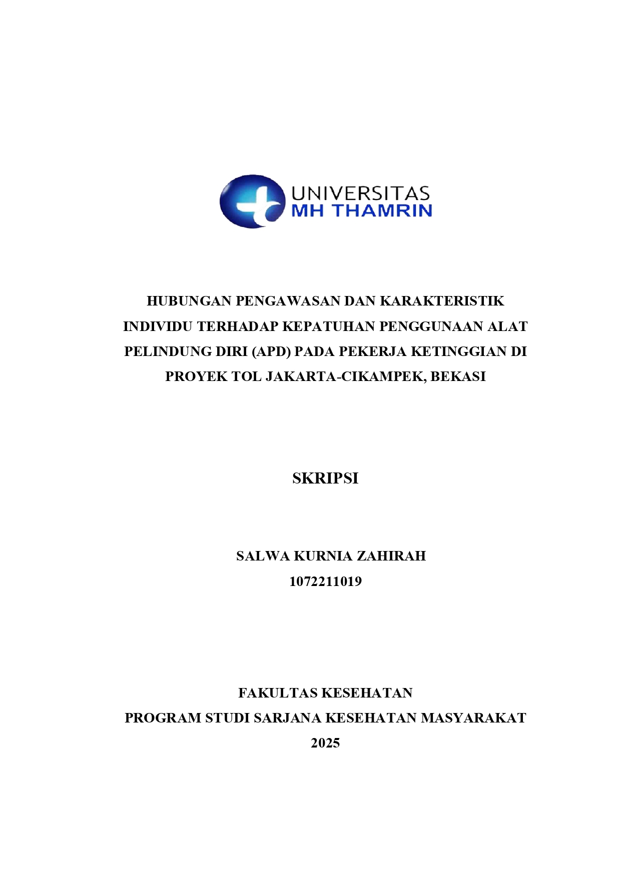 Salwa, Kurnia Zahirah (2025) Hubungan Pengawasan dan Karakteristik Individu terhadap Kepatuhan Penggunaan Alat Pelindung Diri (APD) pada Pekerja Ketinggian di Proyek TOL Jakarta-Cikampek, Bekasi. Other thesis, Universitas Mohammad Husni Thamrin.