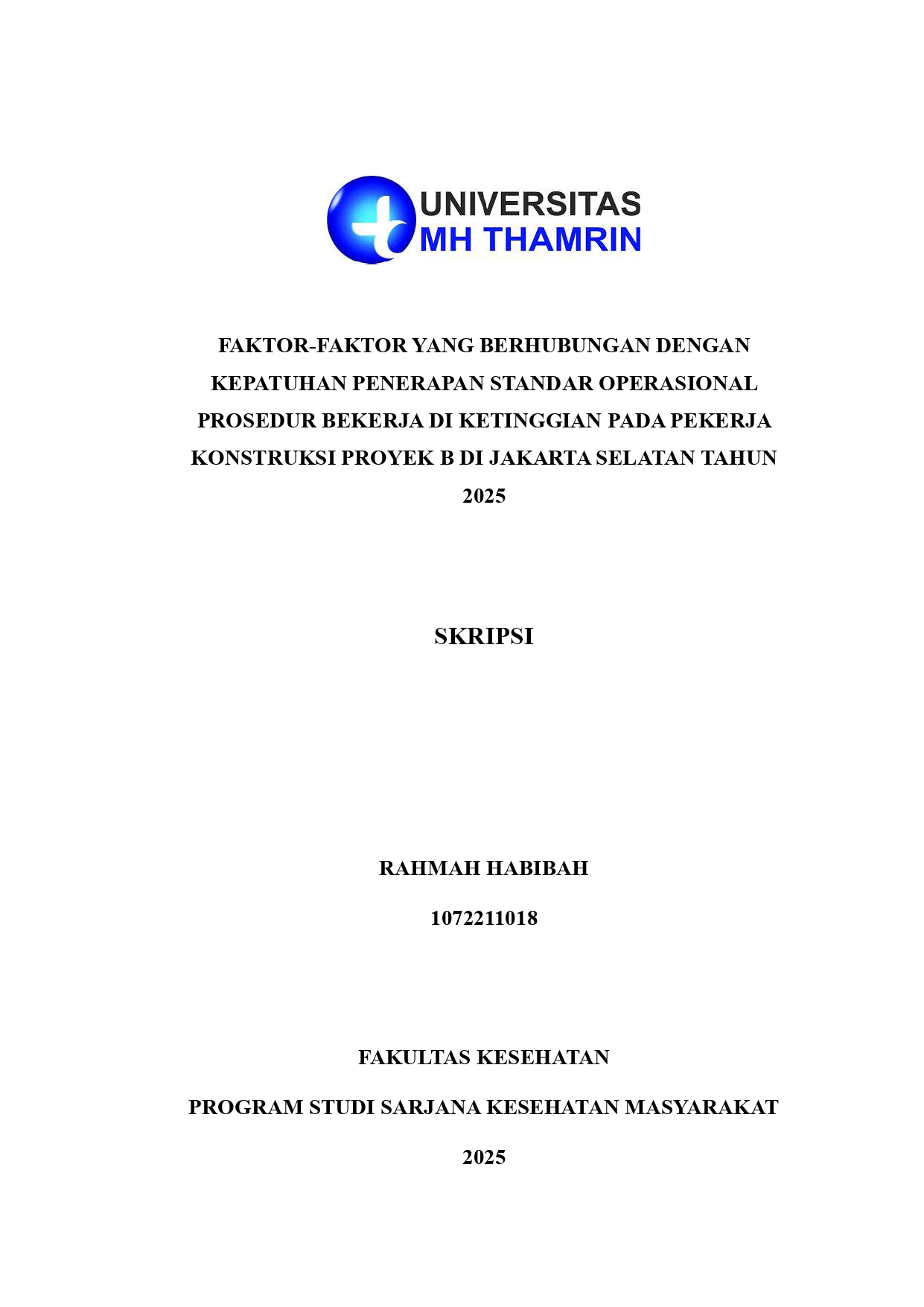 Rahmah, Habibah (2025) Faktor-Faktor yang Berhubungan dengan Kepatuhan Penerapan Standar Operasional Prosedur Bekerja di Ketinggian pada Pekerja Konstruksi Proyek B di Jakarta Selatan Tahun 2025. Other thesis, Universitas Mohammad Husni Thamrin.