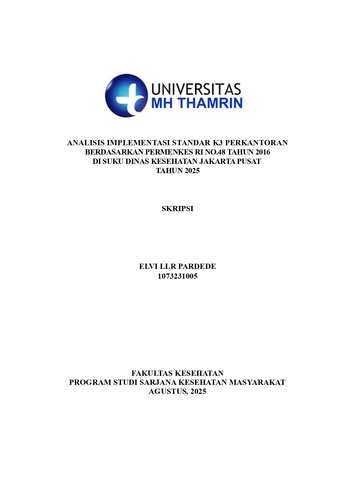 Elvi, LLR Pardede (2025) Analisis Implementasi K3 Perkantoran Berdasarkan PERMENKES RI No.48 Tahun 2016 di Suku Dinas Kesehatan Jakarta Pusat Tahun 2025. Other thesis, Universitas Mohammad Husni Thamrin.