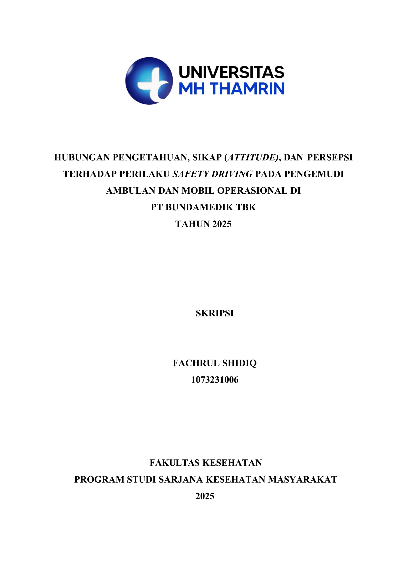 Fachrul, Shidiq (2025) Hubungan Pengetahuan, Sikap (Attitude), dan Persepsi Terhadap Perilaku Safety Driving pada Pengemudi Ambulan dan Mobil Operasional di PT Bundamedik Tbk Tahun 2025. Other thesis, Universitas Mohammad Husni Thamrin.