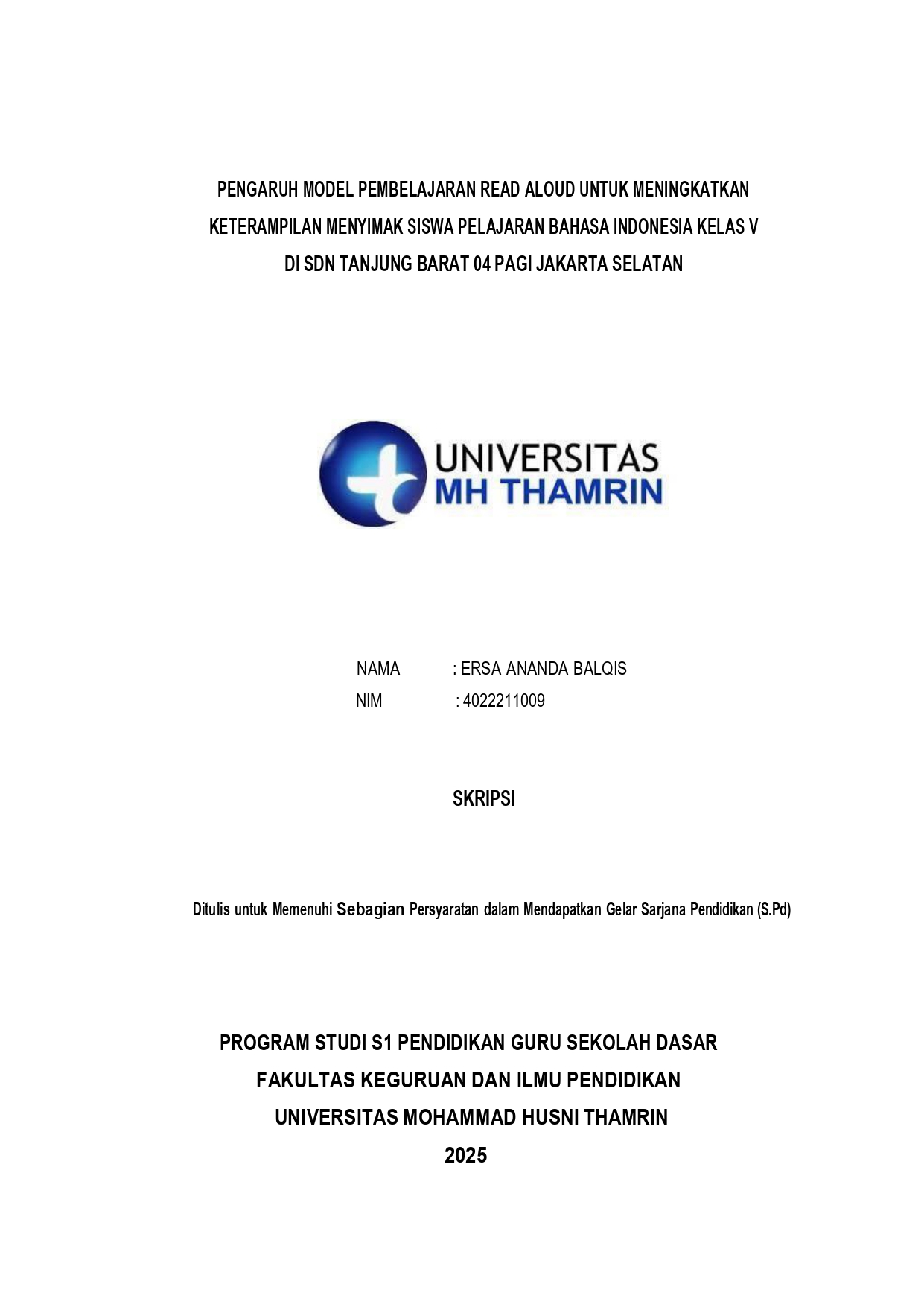 Ersa, Ananda Balqis (2025) Pengaruh Model Pembelajaran Read Aloud untuk Meningkatkan Keterampilan Menyimak Siswa Pelajaran Bahasa Indonesia Kelas V di SDN Tanjung Barat 04 Pagi. Other thesis, Universitas Mohammad Husni Thamrin.