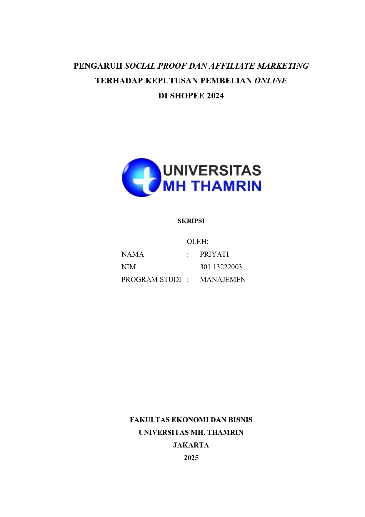 Priyati, Priyati (2025) Pengaruh Social Proof dan Affiliate Marketing terhadap Keputusan Pembelian Online di Shopee 2024. Other thesis, Universitas Mohammad Husni Thamrin.