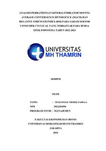 Muhammad Thoriq, Fadilla (2024) Analisis Perbandingan Kinerja Indikator Moving Average Convergence Divergence (MACD) dan Relative Strength Index (RSI) pada Saham Sektor Consumer Cyclical yang Terdaftar pada Bursa Efek Indonesia Tahun 2022 - 2023. Other thesis, Universitas Mohammad Husni Thamrin.