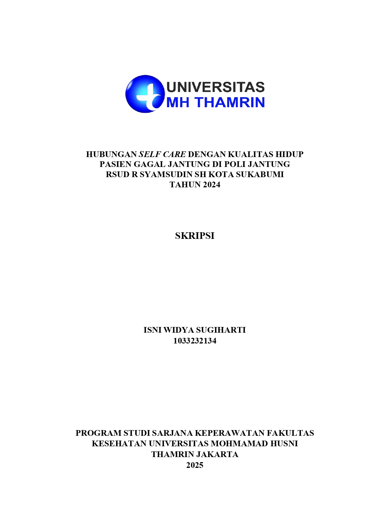Isni, Widya Sugiharti (2025) Hubungan Self Care dengan Kualitas Hidup Pasien Gagal Jantung di Poli Jantung RSUD R Syamsudin SH Kota Sukabumi Tahun 2024. Other thesis, Universitas Mohammad Husni Thamrin.