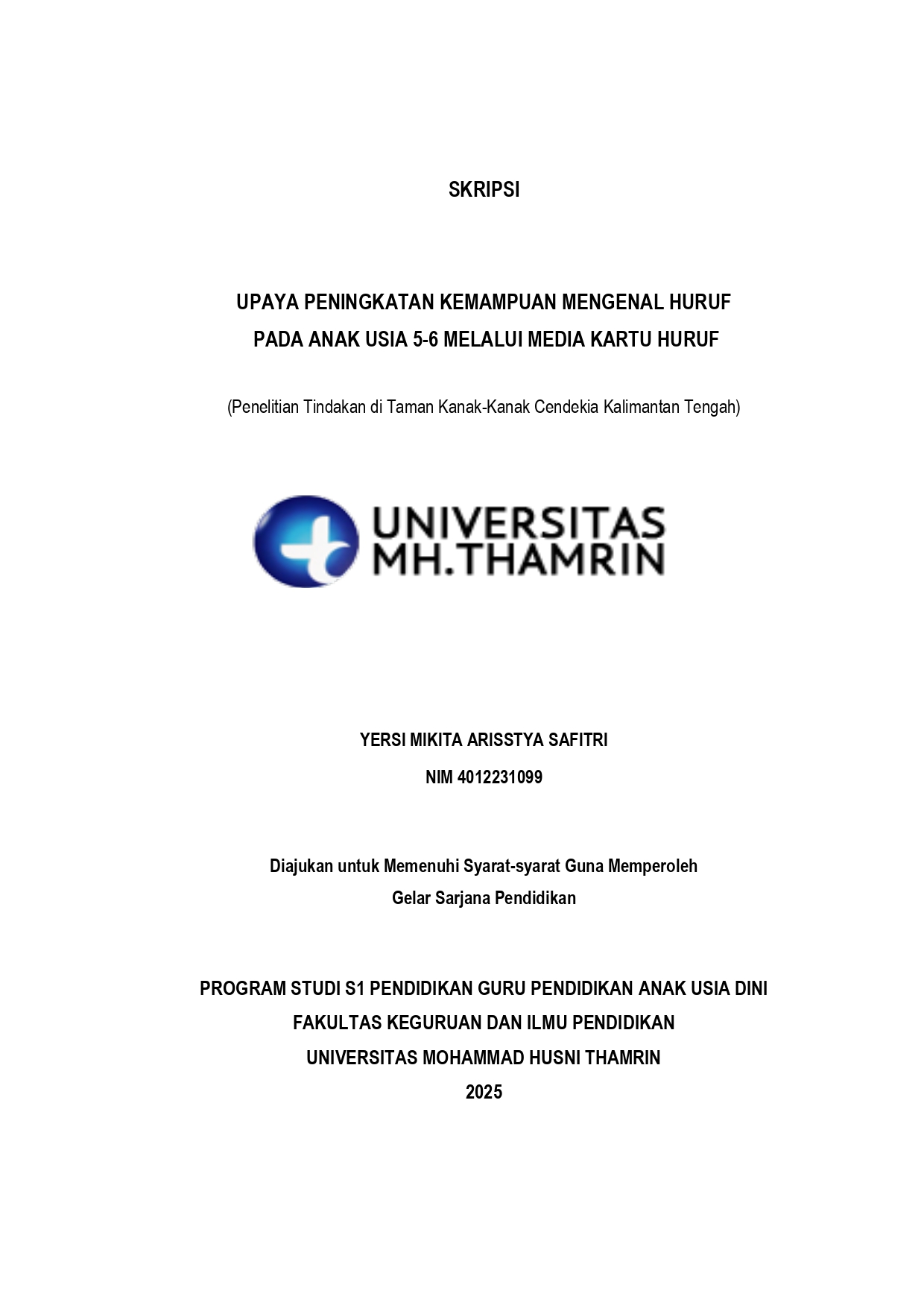Yersi, Mikita Arisstya Safitri (2025) Upaya Peningkatan Kemampuan Mengenal Huruf pada Anak Usia 5 - 6 Melalui Media Kartu Huruf. Other thesis, Universitas Mohammad Husni Thamrin.