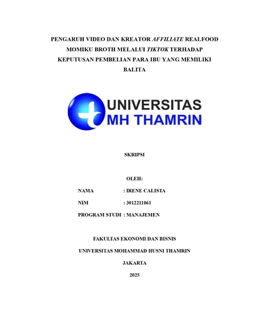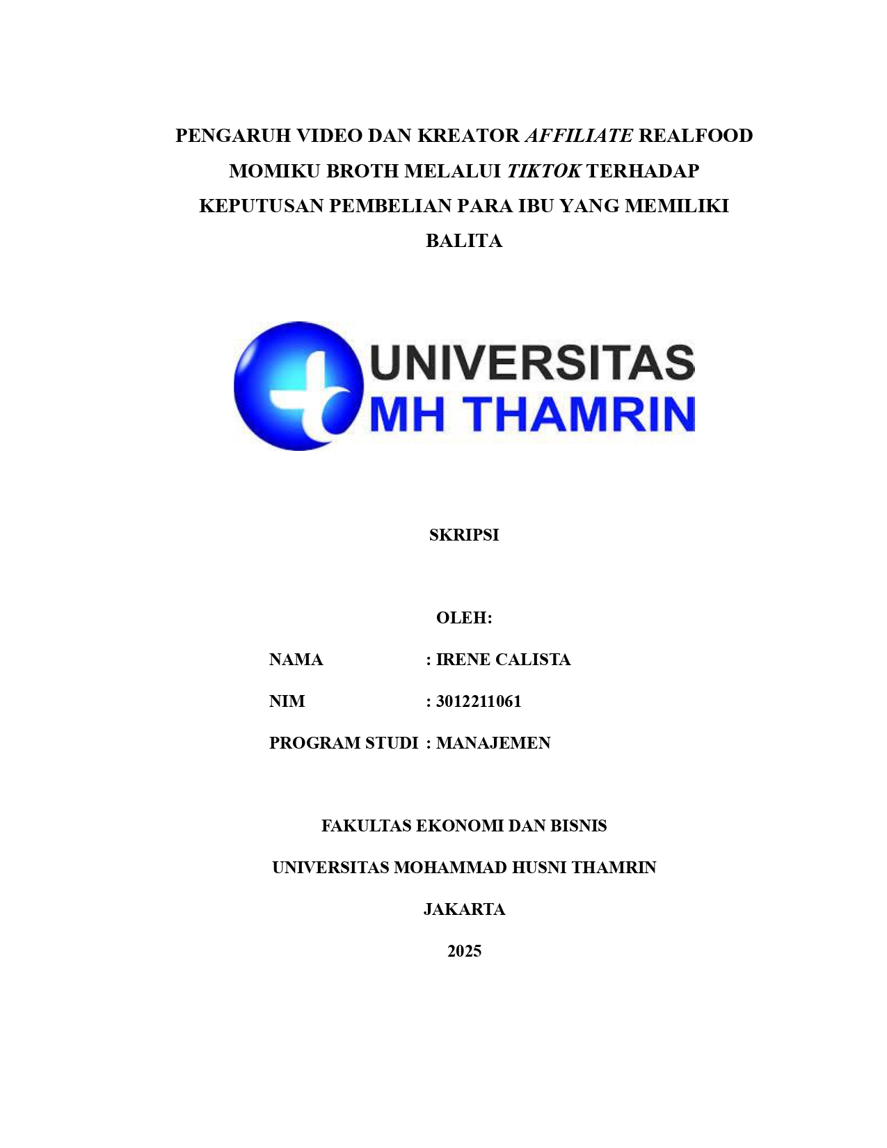 Irene, Calista (2025) Pengaruh Video dan Kreator Affiliate Realfood Momiku Broth Melalui Tiktok terhadap Keputusan Pembelian para Ibu yang Memiliki Balita. Other thesis, Universitas Mohammad Husni Thamrin.