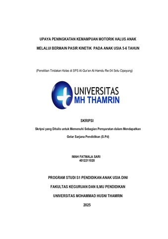 Imah, Fatmala Sari (2025) Upaya Peningkatan Kemampuan Motorik Halus Anak Melalui Bermain Pasir Kinetik pada Anak Usia 5 - 6 Tahun (Penelitian Tindakan Kelas di SPS Paud Al-Qur'an Al-Hamdu Setu Cipayung). Other thesis, Universitas Muhammad Husni Thamrin.