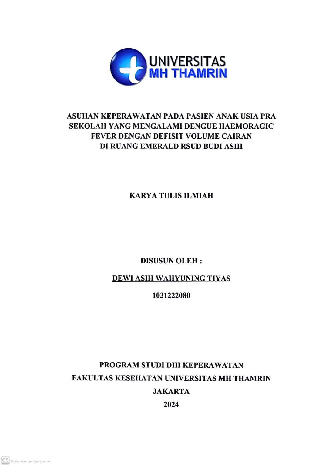 Dewi Asih Wahyuning, Tiyas (2024) Asuhan Keperawatan pada Pasien Anak Usia Pra Sekolah yang Mengalami Dengue Haemorragic Fever dengan Defisit Volume Cairan di Ruang Emerald RSUD Budi Asih. Diploma thesis, Universitas Mohammad Husni Thamrin.