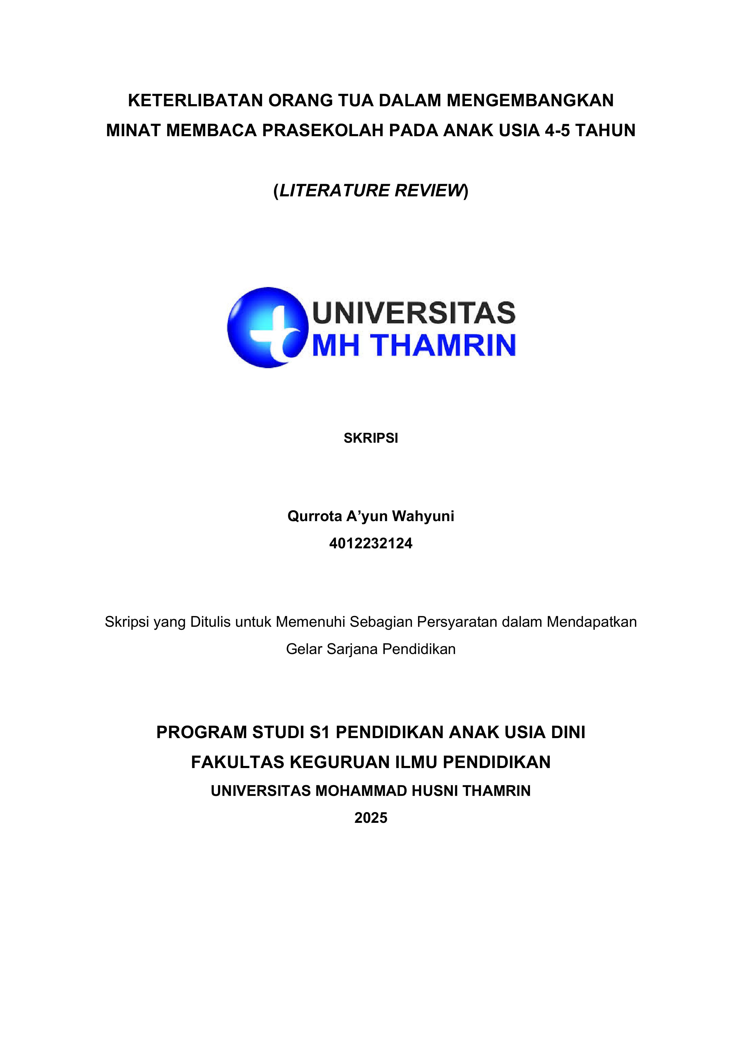 Qurrota, A'yun Wahyuni (2025) Keterlibatan Orang Tua dalam Mengembangkan Minat Membaca Prasekolah pada Anak Usia 4-5 Tahun (Literature Review). Other thesis, Universitas Mohammad Husni Thamrin.