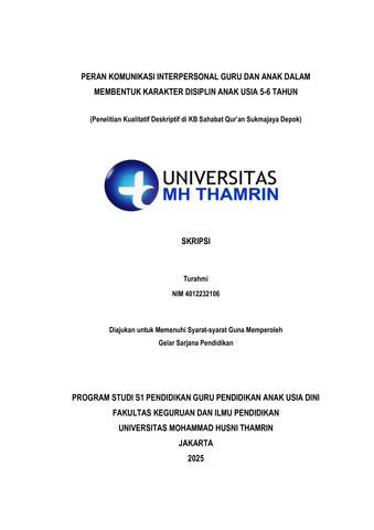 Turahmi, Turahmi (2025) Peran Komunikasi Interpersonal Guru dan Anak dalam Membentuk Karakter Disiplin Anak Usia 5 - 6 Tahun. Other thesis, Universitas Mohammad Husni Thamrin.