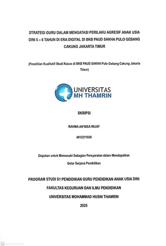 Rahma, An'nisa Wijay (2025) Strategi Guru dalam Mengatasi Perilaku Agresif Anak Usia Dini 5 - 6 Tahun di Era Digital di BKB PAUD Sakha Pulo Gebang Cakung Jakarta Timur. Other thesis, Universitas Mohammad Husni Thamrin.