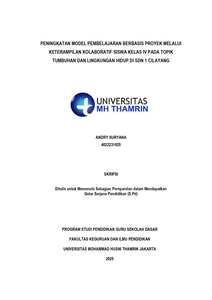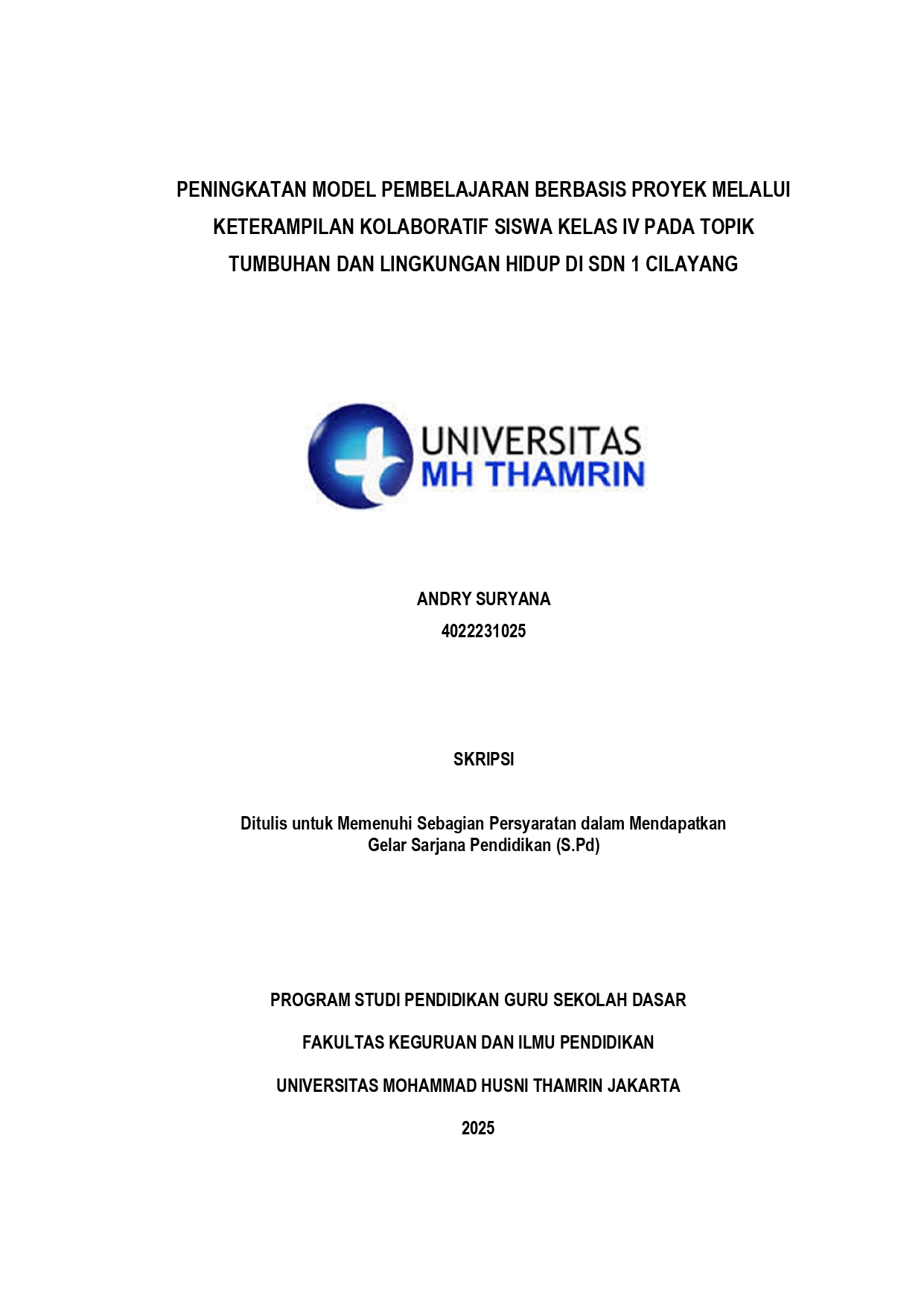 Andry, Suryana (2025) Peningkatan Model Pembelajaran Berbasis Proyek Melalui Keterampilan Kolaboratif Siswa Kelas IV pada Toipk Tumbuhan dan Lingkungan Hidup di SDN 1 Cilayang. Other thesis, Universitas Mohammad Husni Thamrin.