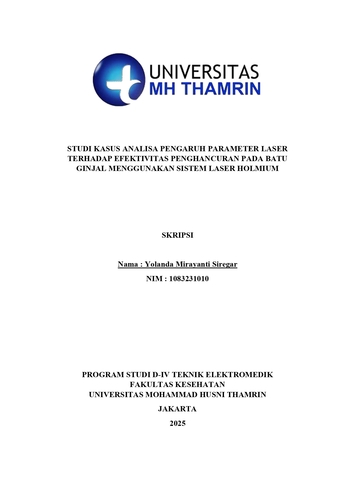 Yolanda, Mirayanti Siregar (2025) Studi Kasus Analisa Pengaruh Parameter Laser terhadap Efektivitas Penghancuran pada Batu Ginjal Menggunakan Sistem Laser Holmium. Diploma thesis, Universitas Mohammad Husni Thamrin.