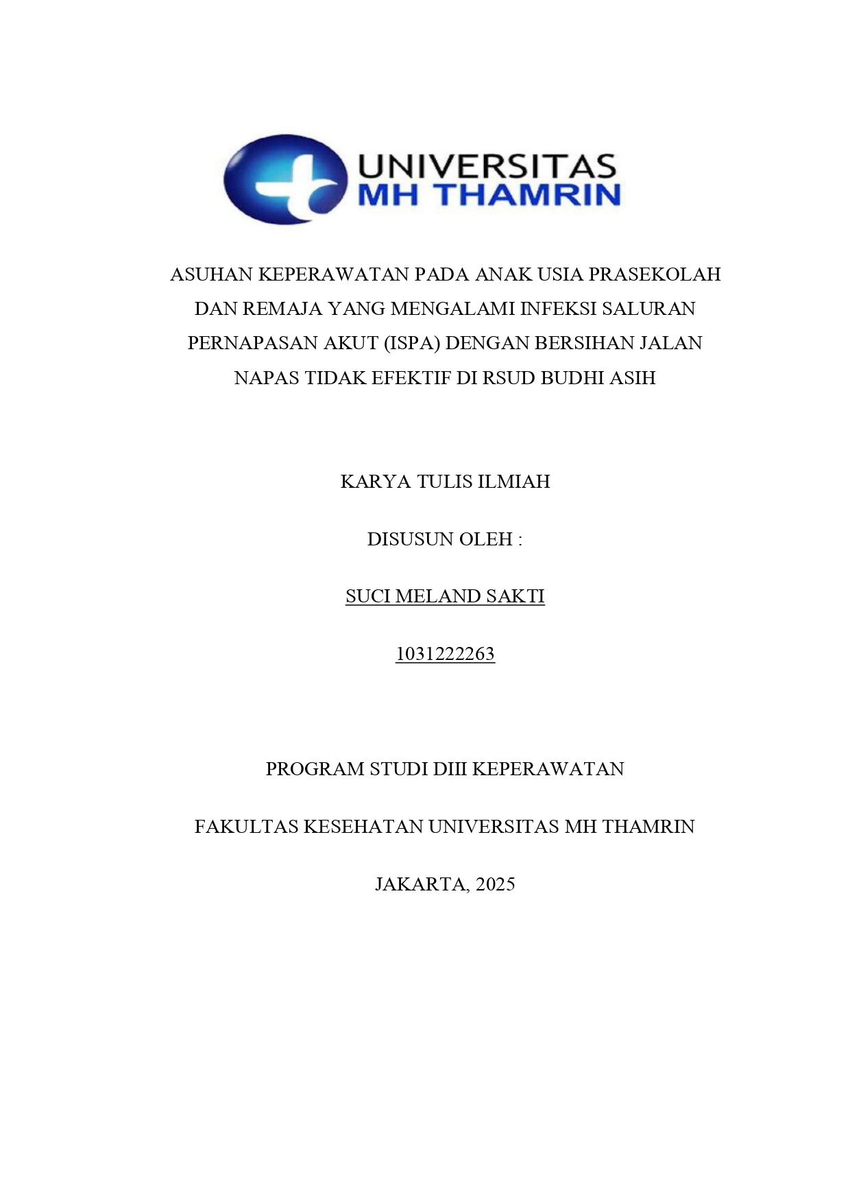 Suci, Meland Sakti (2025) Asuhan Keperawatan pada Anak Usia Prasekolah dan Remaja yang Mengalami Infeksi Saluran Pernapasan Akut dengan Bersihan Jalan Napas Tidak Efektif di RSUD Budhi Asih. Diploma thesis, Universitas Mohammad Husni Thamrin.