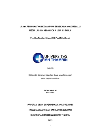 Endah, Wahyuni (2025) Upaya Peningkatan Kemampuan Berbicara Anak Melalui Media Lagu di Kelompok A Usia 4 - 5 Tahun. Other thesis, Universitas Mohammad Husni Thamrin.
