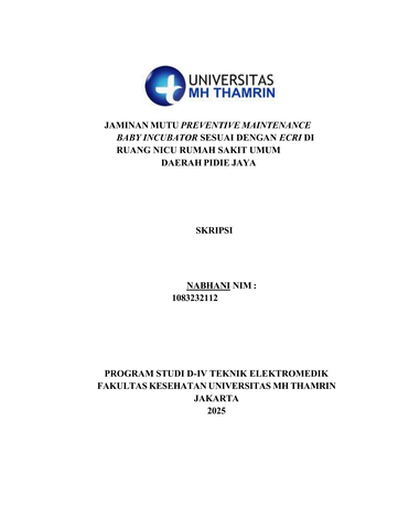 Nabhani, Nabhani (2025) Jaminan Mutu Preventive Maintenance Baby Incubator Sesuai dengan ECRI di Ruang NICU Rumah Sakit Umum Daerah Pidie Jaya. Other thesis, Universitas Mohammad Husni Thamrin.