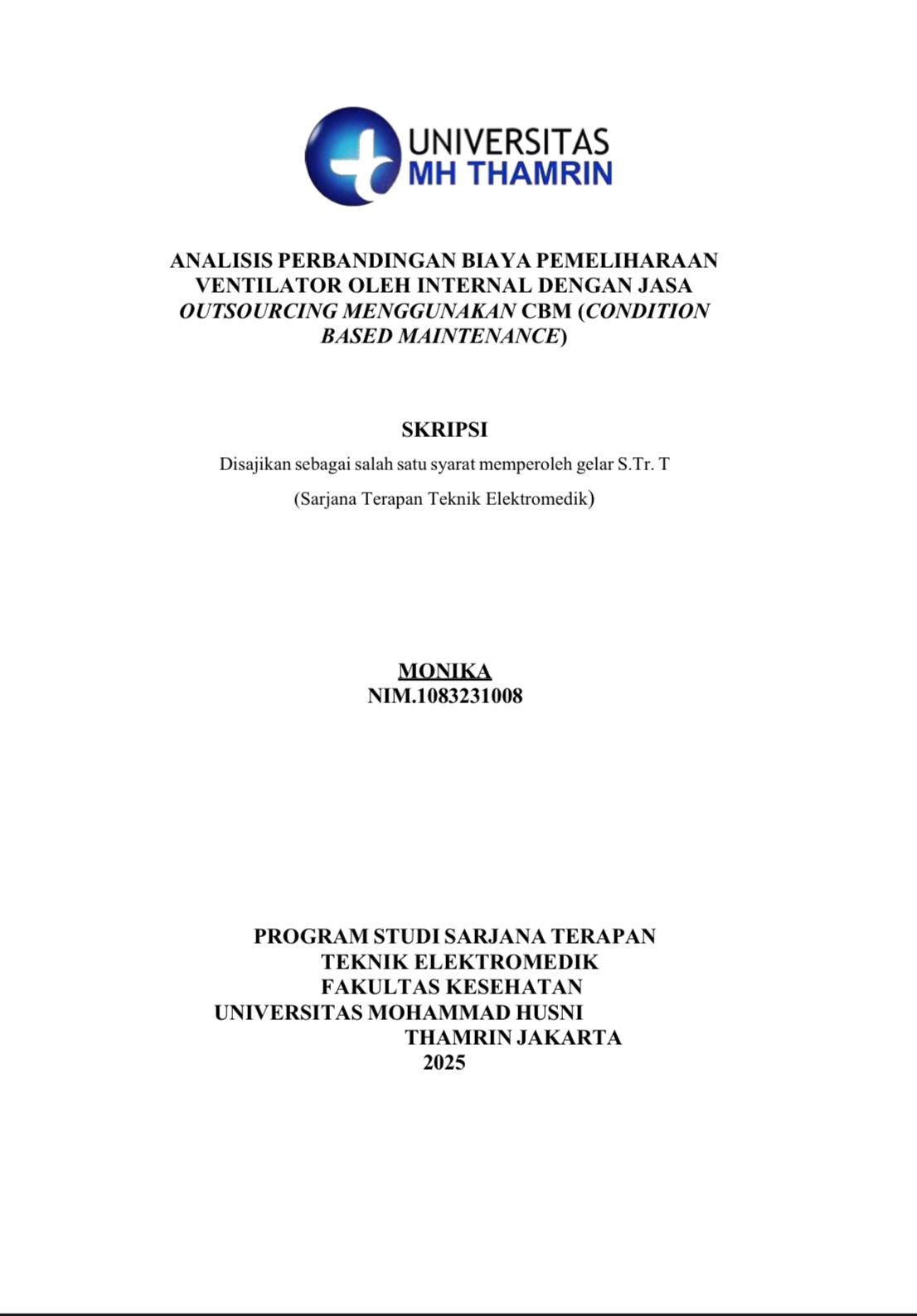 Monika, Monika (2025) Analisis Perbandingan Biaya Pemeliharaan Ventilator oleh Internal dengan Jasa Outsourcing Menggunakan CBM (Condition Based Maintenance). Other thesis, Universitas Mohammad Husni Thamrin.