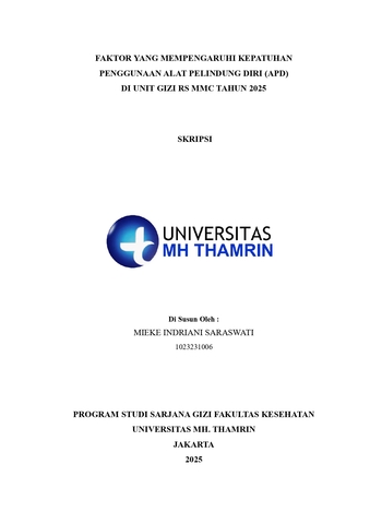 Mieke, Indriani Saraswati (2025) Faktor yang Mempengaruhi Kepatuhan Penggunaan Alat Pelindung Diri (APD) di Unit Gizi RS MMC Tahun 2025. Other thesis, Universitas Mohammad Husni Thamrin.