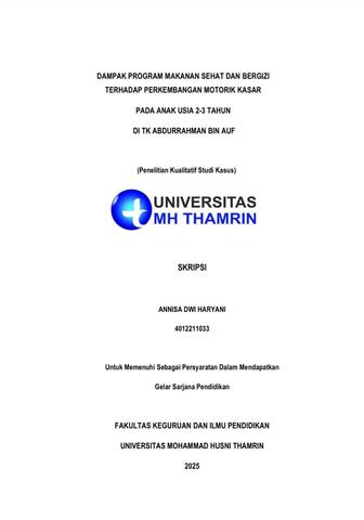 Annisa, Dwi Haryani (2025) Dampak Program Makanan Sehat dan Bergizi terhadap Perkembangan Motorik Kasar pada Anak Usia 2 - 3 Tahun di TK Abdurrahman bin Auf. Other thesis, Universitas Mohammad Husni Thamrin.