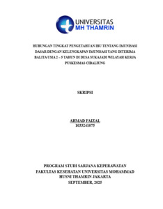 Ahmad, Faizal (2025) Hubungan Tingkat Pengetahuan Ibu tentang Imunisasi Dasar dengan Kelengkapan Imunisasi yang Diterima Balita Usia 2-5 Tahun di Desa Sukajadi Wilayah Kerja Puskesmas Cibaliung. Other thesis, Universitas Mohammad Husni Thamrin.