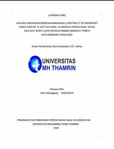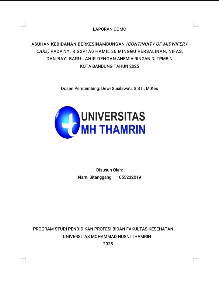 Narni, Sitanggang (2025) Asuhan Kebidanan Berkesinambungan (Continuity of Midwifery Care) pada Ny R G2P1A0 Hamil 36 Minggu, Persalinan, Nifas, dan Bayi Baru Lahir dengan Anemia Ringan di TPMB N Kota Bandung Tahun 2025. Other thesis, Universitas Mohammad Husni Thamrin.