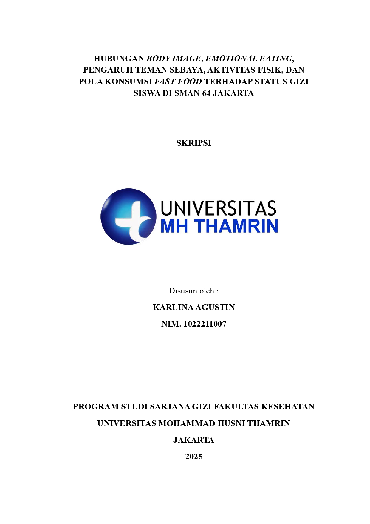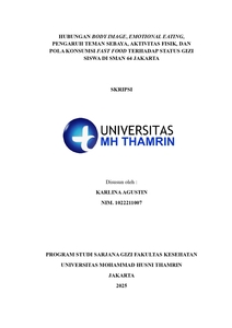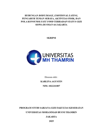 Karlina, Agustin (2025) Hubungan Body Image, Emotional Eating, Pengaruh Teman Sebaya, Aktivitas Fisik, dan Pola Konsumsi Fast Food terhadap Status Gizi Siswa di SMAN 64 Jakarta. Other thesis, Universitas Mohammad Husni Thamrin.