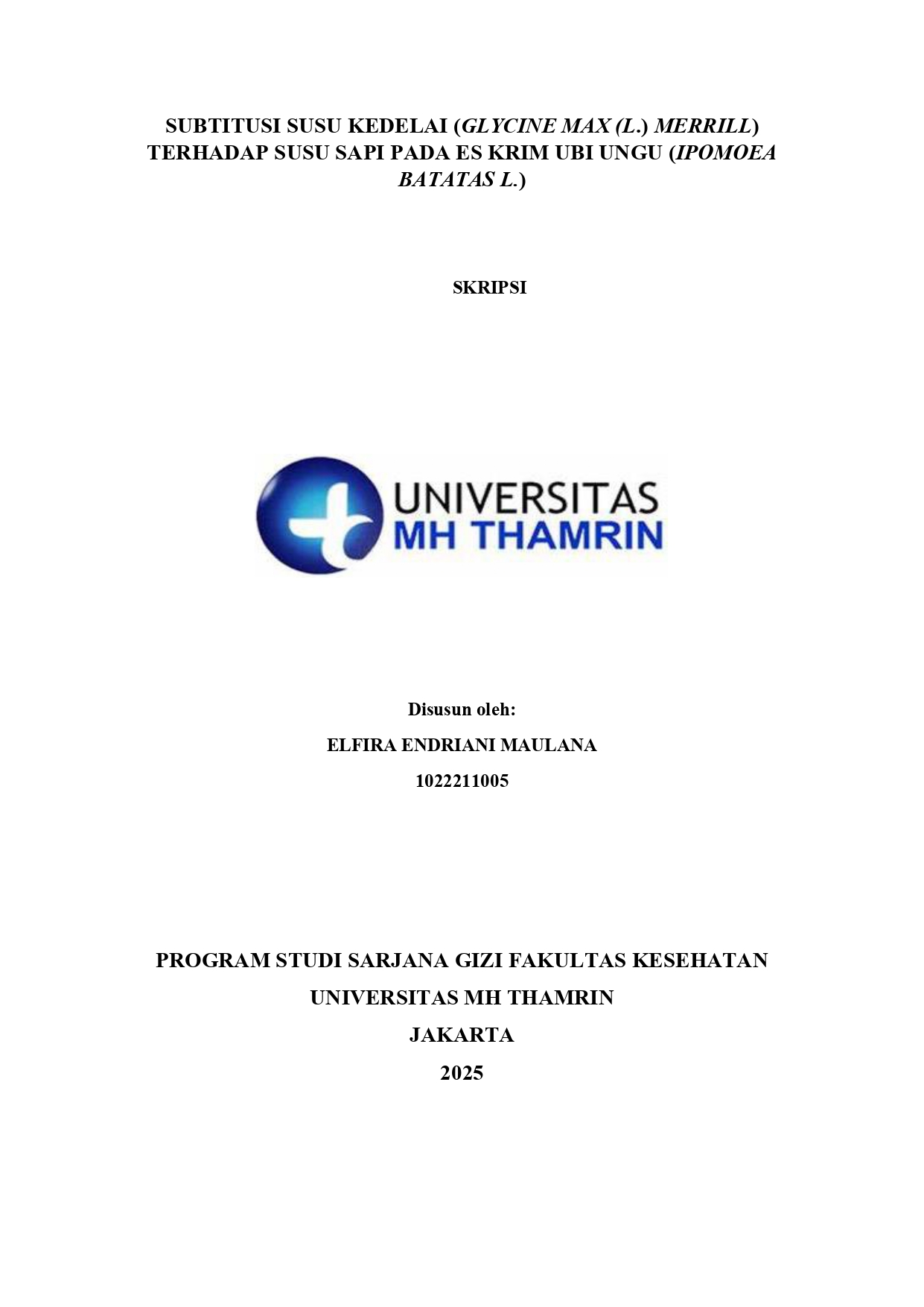 Elfira, Endriani Maulana (2025) Subtitusi Susu Kedelai (Glycine Max (L.) Merrill) terhadap Susu Sapi pada Es Krim Ubi Ungu (Ipomoea Batatas L.). Other thesis, Universitas Mohammad Husni Thamrin.