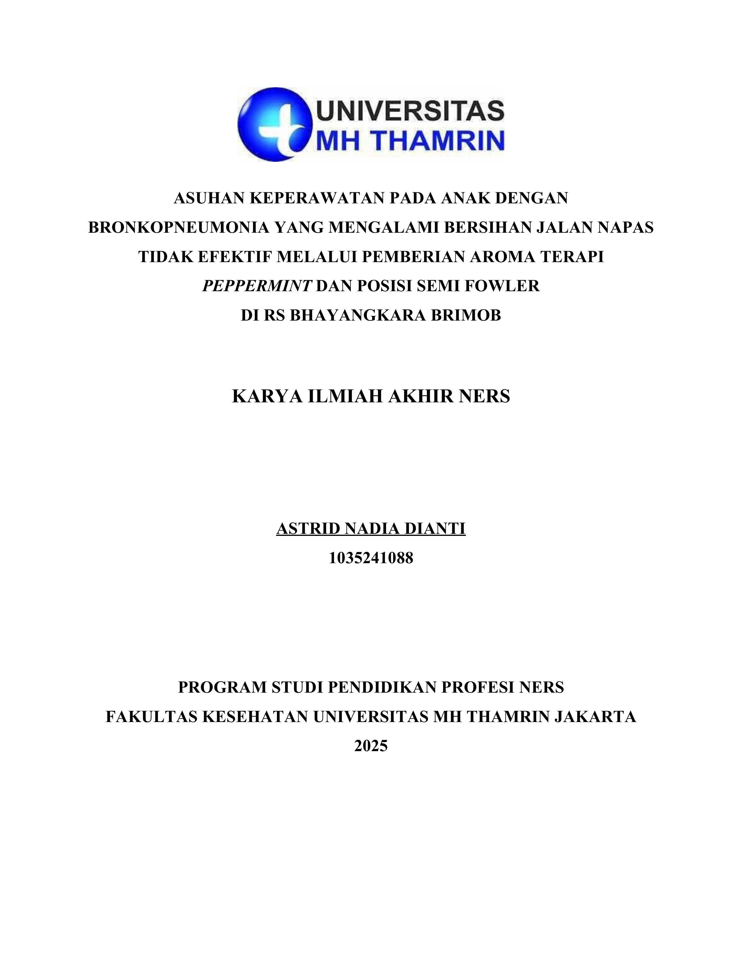 Astrid, Nadia Dianti (2025) Asuhan Keperawatan pada Anak dengan Bronkopneumonia yang Mengalami Bersihan Jalan Napas tidak Efektif Melalui Pemberian Aroma Terapi Peppermint dan Posisi Semi Fowler di RS Bhayangkara Brimob. Other thesis, Universitas Mohammad Husni Thamrin.
