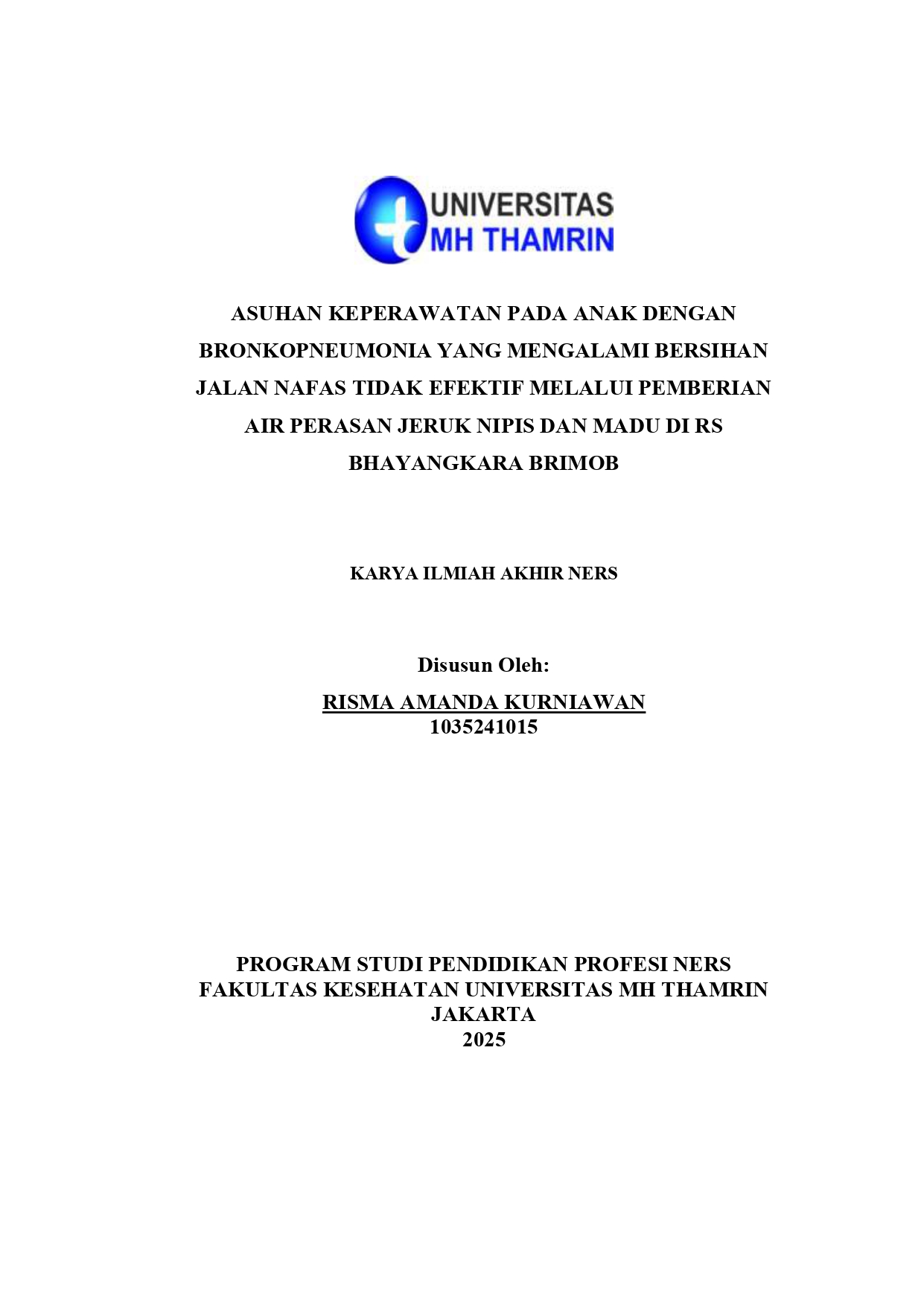 Risma, Amanda Kurniawan (2025) Asuhan Keperawatan pada Anak dengan Bronkopneumonia yang Mengalami Bersihan Jalan Nafas tidak Efektif Melalui Pemberian Air Perasan Jeruk Nipis dan Madu di RS Bhayangkara Brimob. Other thesis, Universitas Mohammad Husni Thamrin.