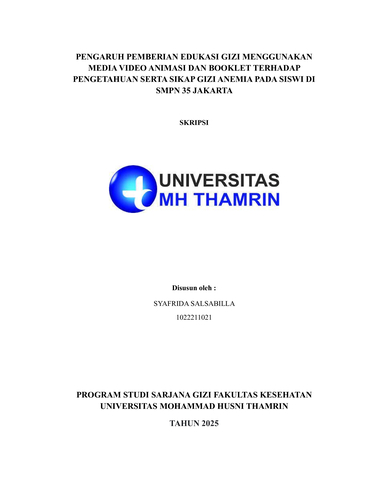 Syafrida, Salsabilla (2025) Pengaruh Pemberian Edukasi Gizi Menggunakan Media Video Animasi dan Booklet terhadap Pengetahuan Serta Sikap Gizi Anemia pada Remaja Putri di SMPN 35 Jakarta. Other thesis, Universitas Mohammad Husni Thamrin.