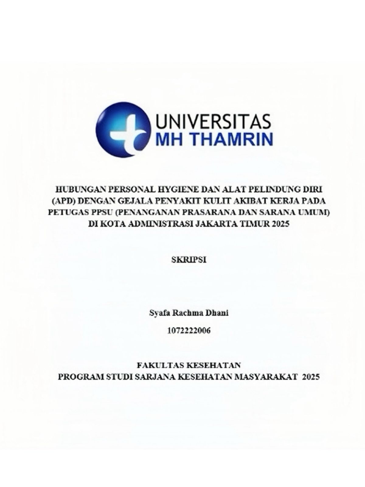Syafa, Rachma Dhani and UNSPECIFIED (2025) HUBUNGAN PERSONAL HYGIENE DAN ALAT PELINDUNG DIRI (APD) DENGAN GEJALA PENYAKIT KULIT AKIBAT KERJA PADA PETUGAS PPSU (PENANGANAN PRASARANA DAN SARANA UMUM) DI KOTA ADMINISTRASI JAKARTA TIMUR 2025. Other thesis, Universitas Mohammad Husni Thamrin.