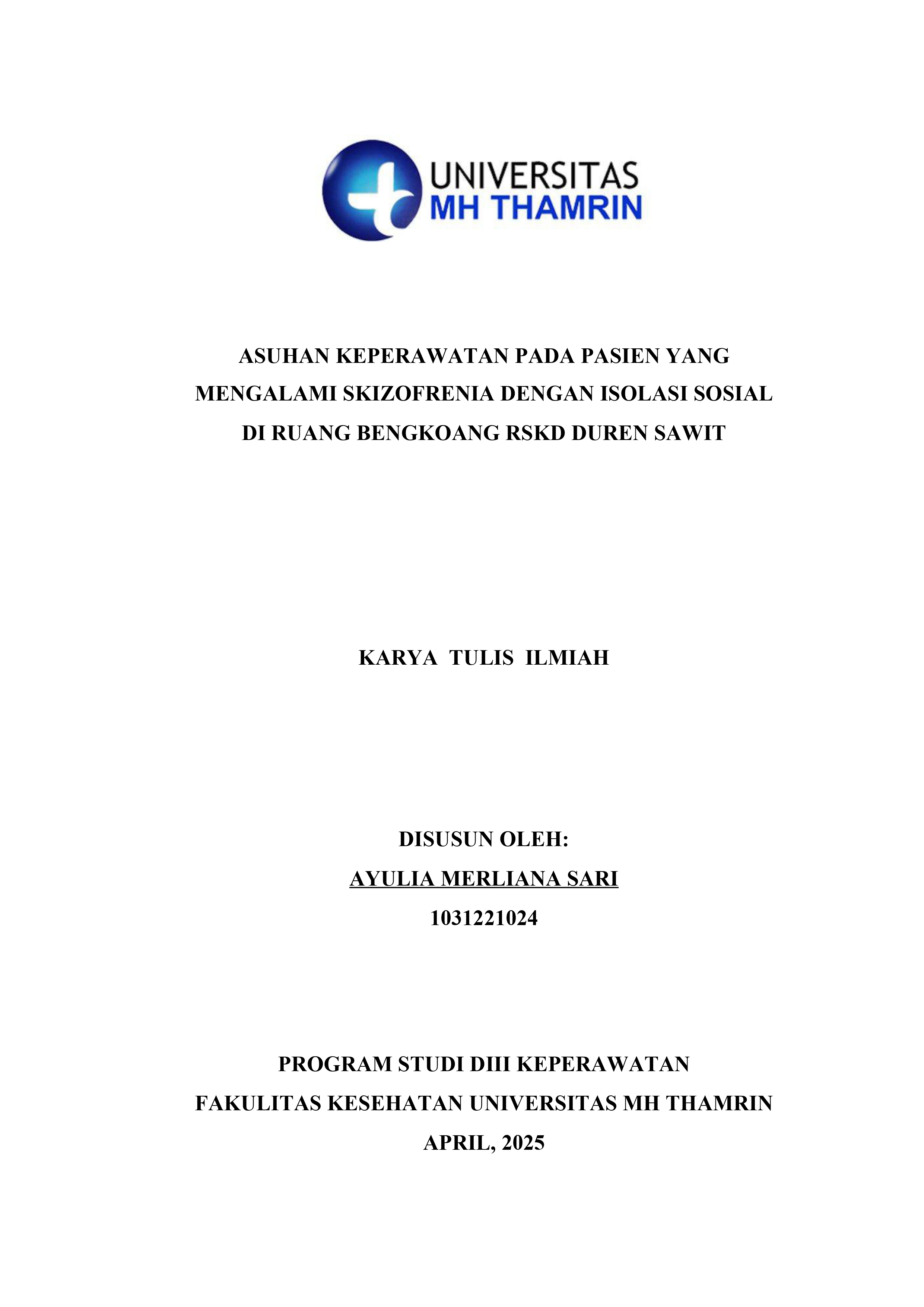 Ayulia, Merliana Sari (2025) Asuhan Keperawatan pada Pasien yang Mengalami Skizofrenia dengan Isolasi Sosial di Ruang Bengkoang RSKD Duren Sawit. Diploma thesis, Universitas Mohammad Husni Thamrin.