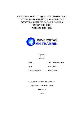 Shifa, Nurhalidza (2025) Pengaruh Debt To Equity Ratio (DER) dan Gross Profit Margin (GPM) terhadap Financial Distress pada PT Garuda Indonesia Tbk Periode 2019 - 2023. Other thesis, Universitas Mohammad Husni Thamrin.