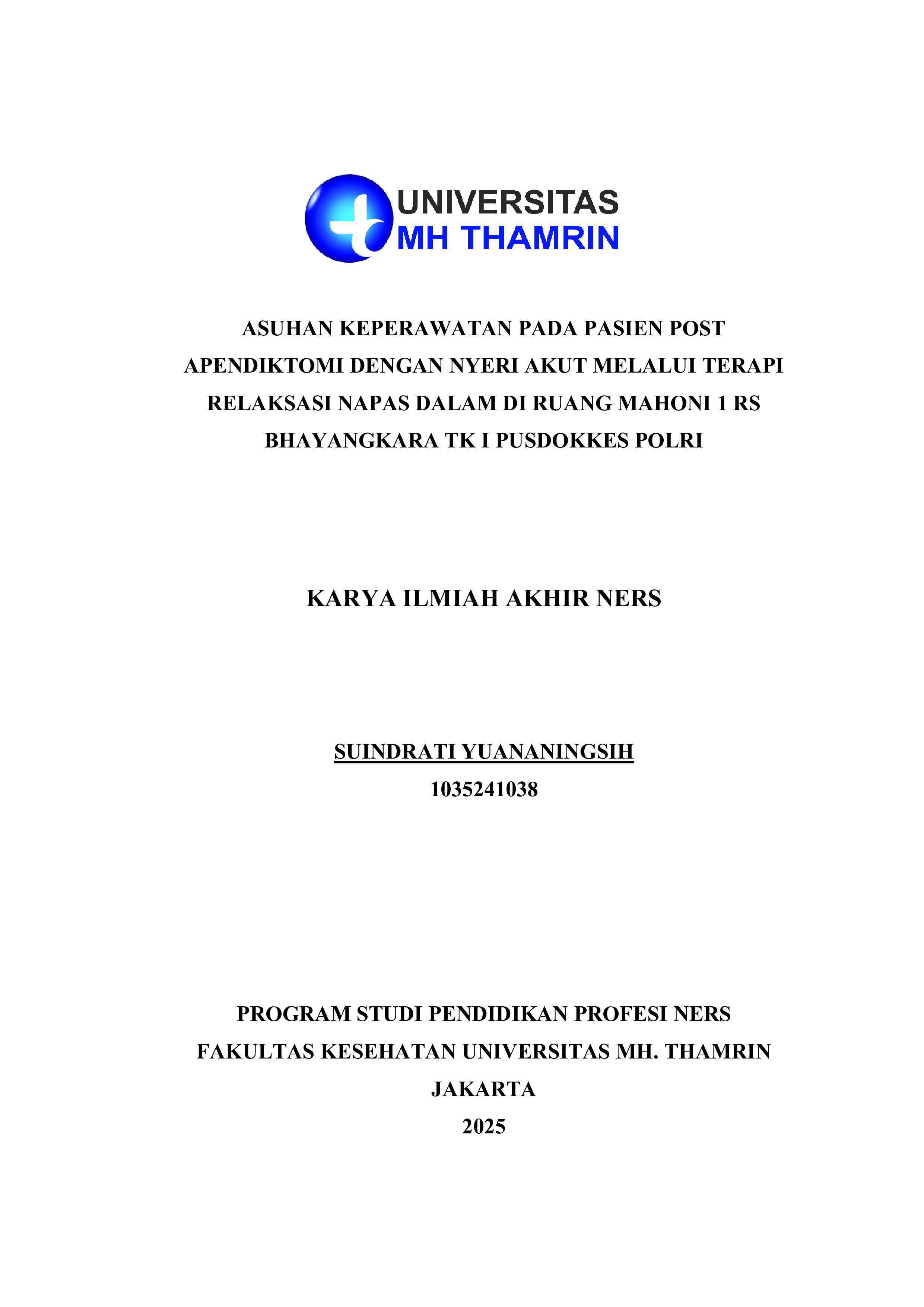 Suindrati, Yuananingsih (2025) Asuhan Keperawatan pada Pasien Post Apendiktomi dengan Nyeri Akut Melalui Terapi Relaksasi Napas Dalam di Ruang Mahoni 1 RS Bhayangkara TK I Pusdokkes Polri. Other thesis, Universitas Mohammad Husni Thamrin.