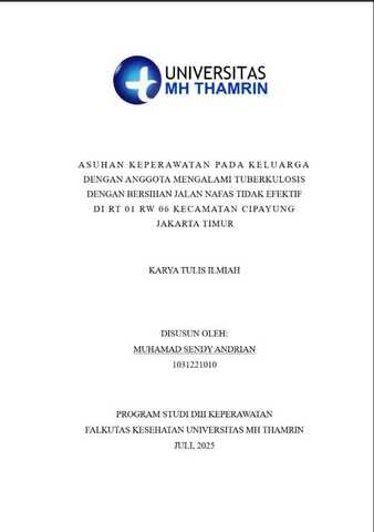 Muhamad, Sendy Andrian (2025) Asuhan Keperawatan pada Keluarga dengan Anggota Mengalami Tuberkulosis dengan Bersihan Jalan Nafas tidak Efektifitas di RT 01 RW 06 Kecamatan Cipayung Jakarta Timur. Diploma thesis, Universitas Mohammad Husni Thamrin.