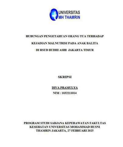 Diva, Pramulya (2025) Hubungan Pengetahuan Orang Tua terhadap Kejadian Malnutrisi pada Anak Balita di RSUD Budhi Asih Jakarta Timur. Other thesis, Universitas Mohammad Husni Thamrin.