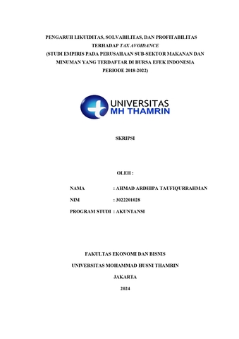 Ahmad Ardhipa, Taufiqurrahman (2024) PENGARUH LIKUIDITAS, SOLVABILITAS, DAN PROFITABILITAS TERHADAP TAX AVOIDANCE (STUDI EMPIRIS PADA PERUSAHAAN SUB-SEKTOR MAKANAN DAN MINUMAN YANG TERDAFTAR DI BURSA EFEK INDONESIA PERIODE 2018-2022). Other thesis, Universitas Mohammad Husni Thamrin.