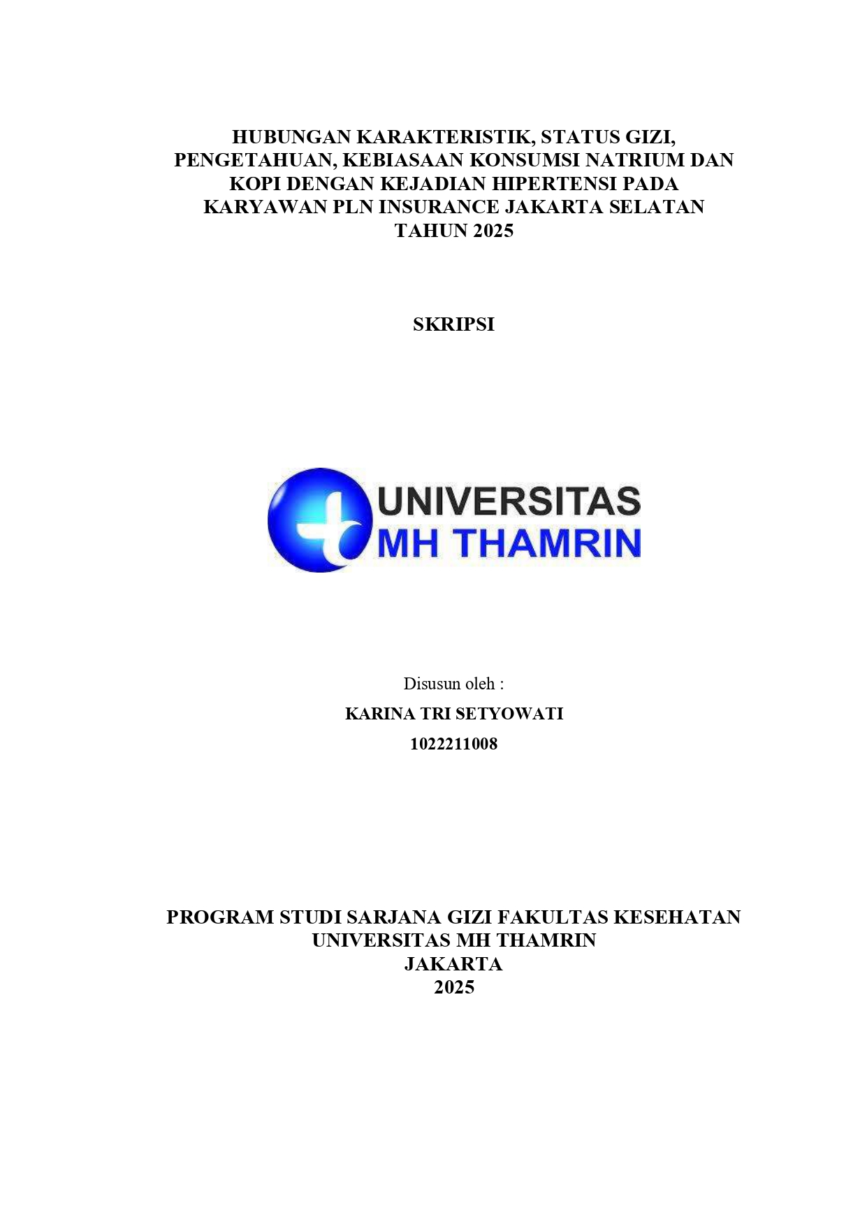 Karina, Tri Setyowati (2025) Hubungan Karakteristik, Status Gizi, Pengetahuan, Kebiasaan Konsumsi Natrium dan Kopi dengan Kejadian Hipertensi pada Karyawan PLN Insurance Jakarta Selatan Tahun 2025. Other thesis, Universitas Mohammad Husni Thamrin.