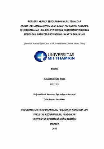 Elisa, Maurenta Anisa (2025) Persepsi Kepala Sekolah dan Guru terhadap Akreditasi Lembaga PAUD oleh Badan Akreditasi Nasional Pendidikan Anak Usia Dini, Pendidikan Dasar dan Pendidikan Menengah (BAN-PDM) Provinsi DKI Jakarta Tahun 2025. Other thesis, Universitas Mohammad Husni Thamrin.