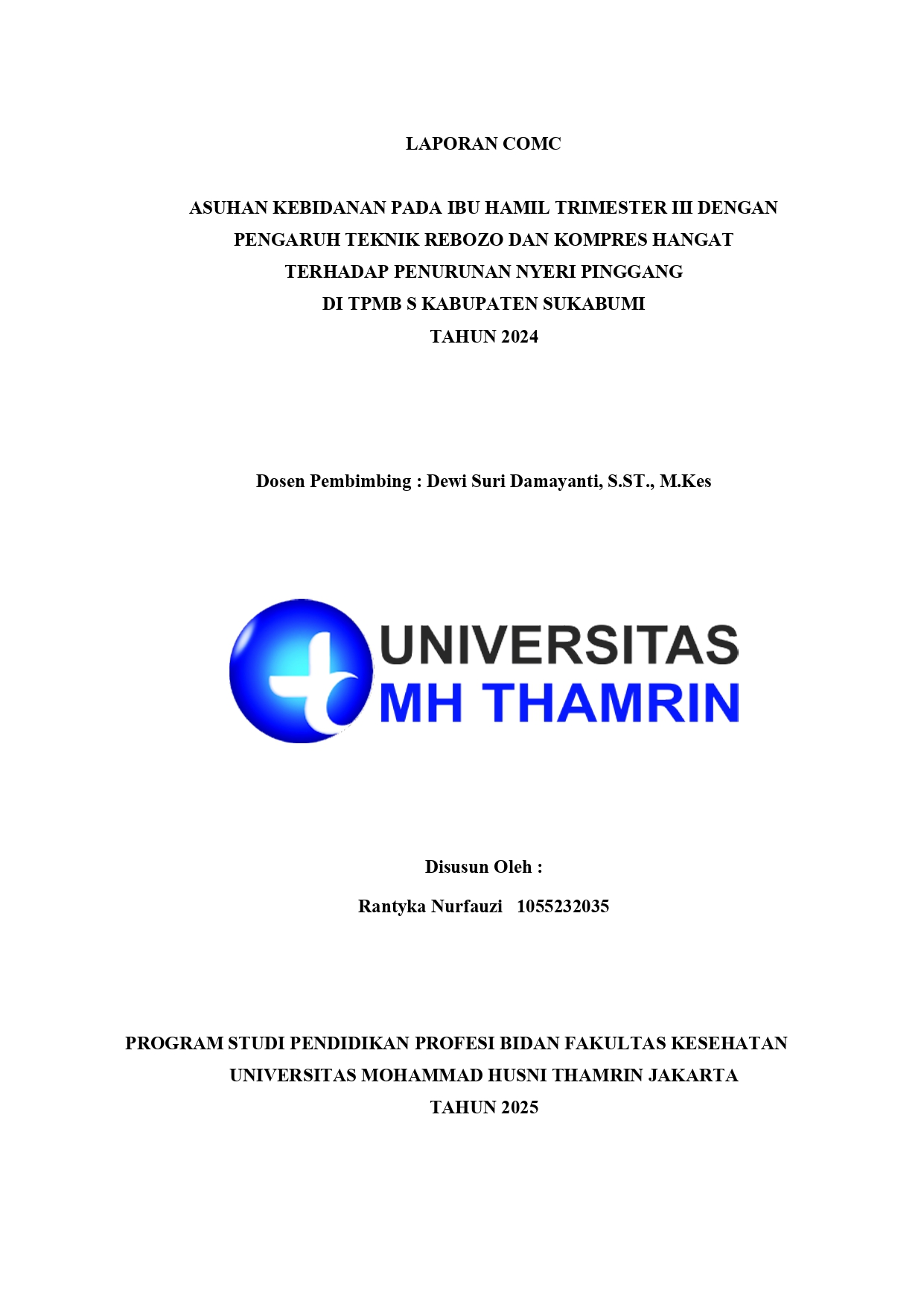 Rantyka, Nurfauzi (2025) Asuhan Kebidanan pada Ibu Hamil Trimester III dengan Pengaruh Teknik Rebozo dan Kompres Hangat terhadap Penurunan Nyeri Pinggang di TPMB S Kabupaten Sukabumi Tahun 2024. Other thesis, Universitas Mohammad Husni Thamrin.