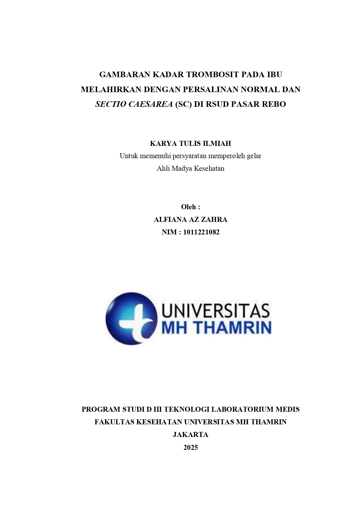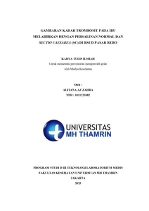 Alfiana, Az Zahra (2025) Gambaran Kadar Trombosit pada Ibu Melahirkan dengan Persalinan Normal dan Sectio Caesarea (SC) di RSUD Pasar Rebo. Diploma thesis, Universitas Mohammad Husni Thamrin.