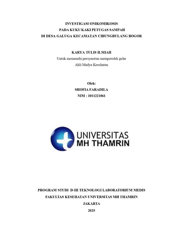 Shofia, Faradila (2025) Investigasi Onikomikosis pada Kuku Kaki Petugas Sampah di Desa Galuga Kecamatan Cibungbulang Bogor. Diploma thesis, Universitas Mohammad Husni Thamrin.
