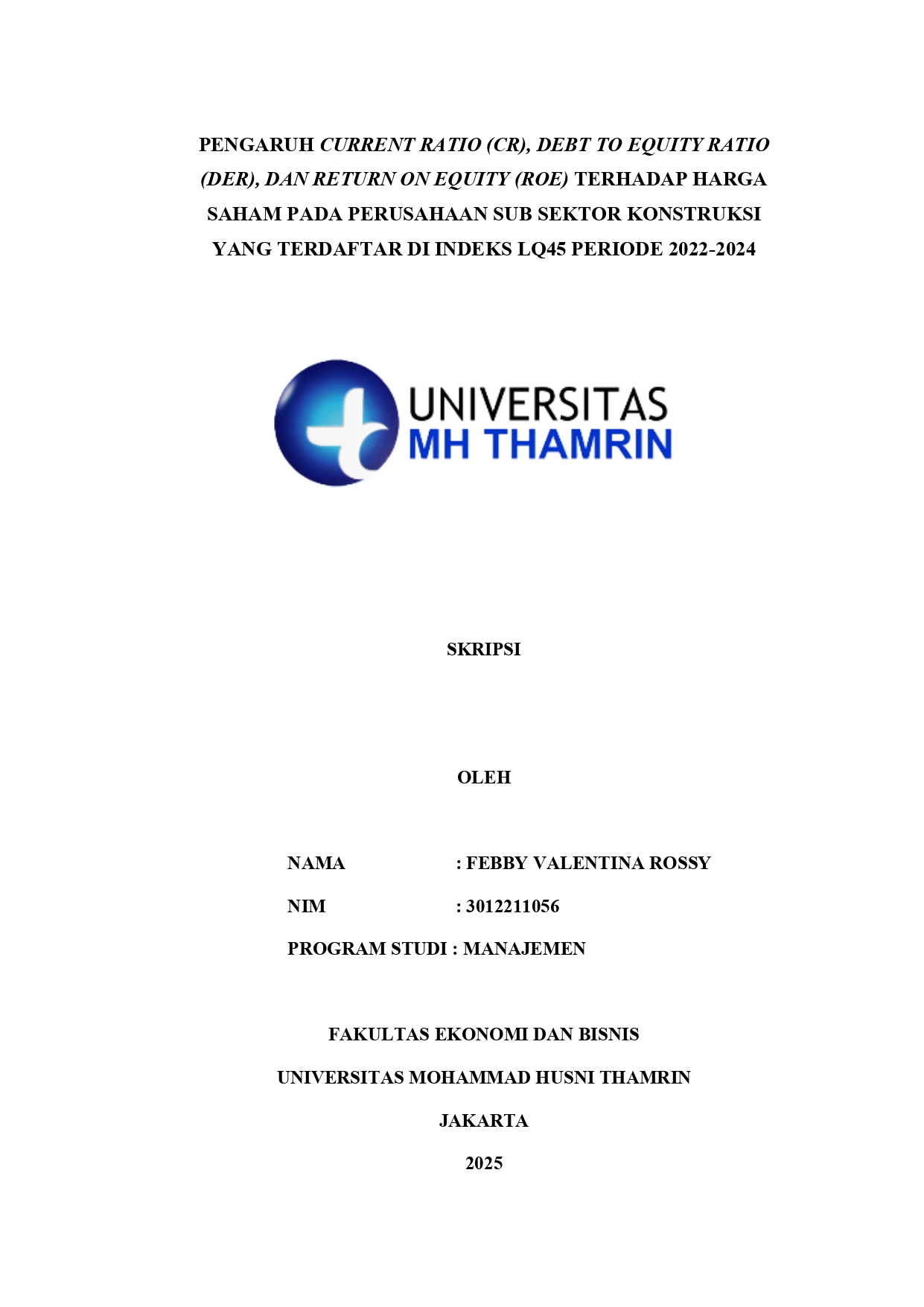 Febby, Valentina Rossy (2025) Pengaruh Current Ratio (CR), Debt to Equity Ratio (DER), dan Return on Equity (ROE) terhadap Harga Saham pada Sub Sektor Konstruksi yang Terdaftar di Indeks LQ45 Periode 2022 - 2024. Other thesis, Universitas Mohammad Husni Thamrin.