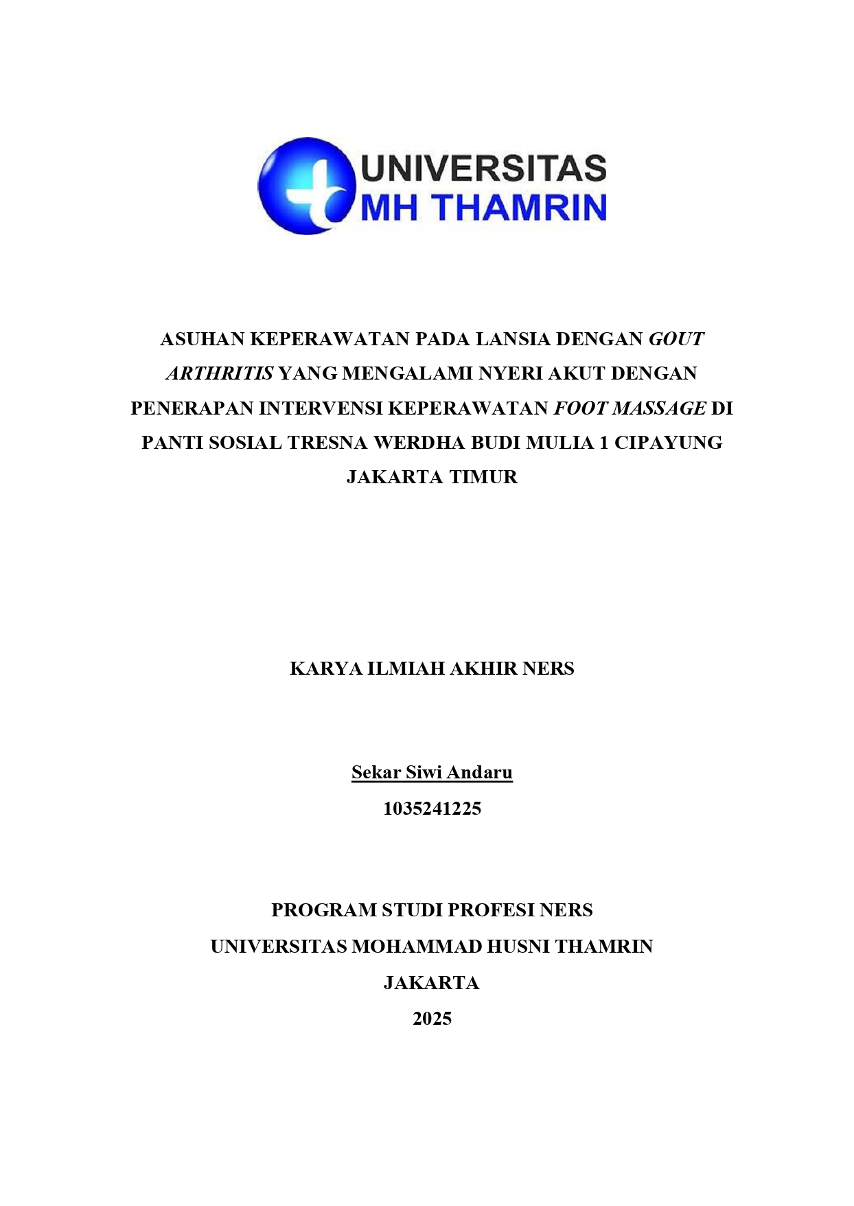 Sekar Siwi, Andaru (2025) Asuhan Keperawatan pada Lansia dengan Gout Arthritis yang Mengalami Nyeri Akut dengan Penerapan Intervensi Keperawatan Foot Massage di Panti Sosial Tresna Werdha Budi Mulia 1 Cipayung Jakarta Timur. Other thesis, Universitas Mohammad Husni Thamrin.