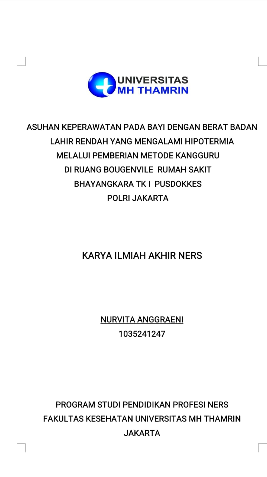 Nurvita, Anggraeni (2025) Asuhan Keperawatan pada Bayi dengan Berat Badan Lahir Rendah yang Mengalami Hipotermia Melalui Pemberian Metode Kangguru di Ruang Bougenvile Rumah Sakit Bhayangkara TK I Pusdokkes Polri Jakarta. Other thesis, Universitas Mohammad Husni Thamrin.