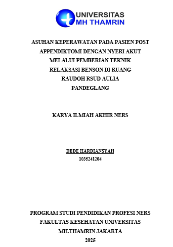 Dede, Hardiansyah (2025) Asuhan Keperawatan pada Pasien Post Appendiktomi dengan Nyeri Akut Melalui Pemberian Tekhnik Relaksasi Benson di Ruang Raudoh RSUD Aulia Pandeglang. Other thesis, Universitas Mohammad Husni Thamrin.